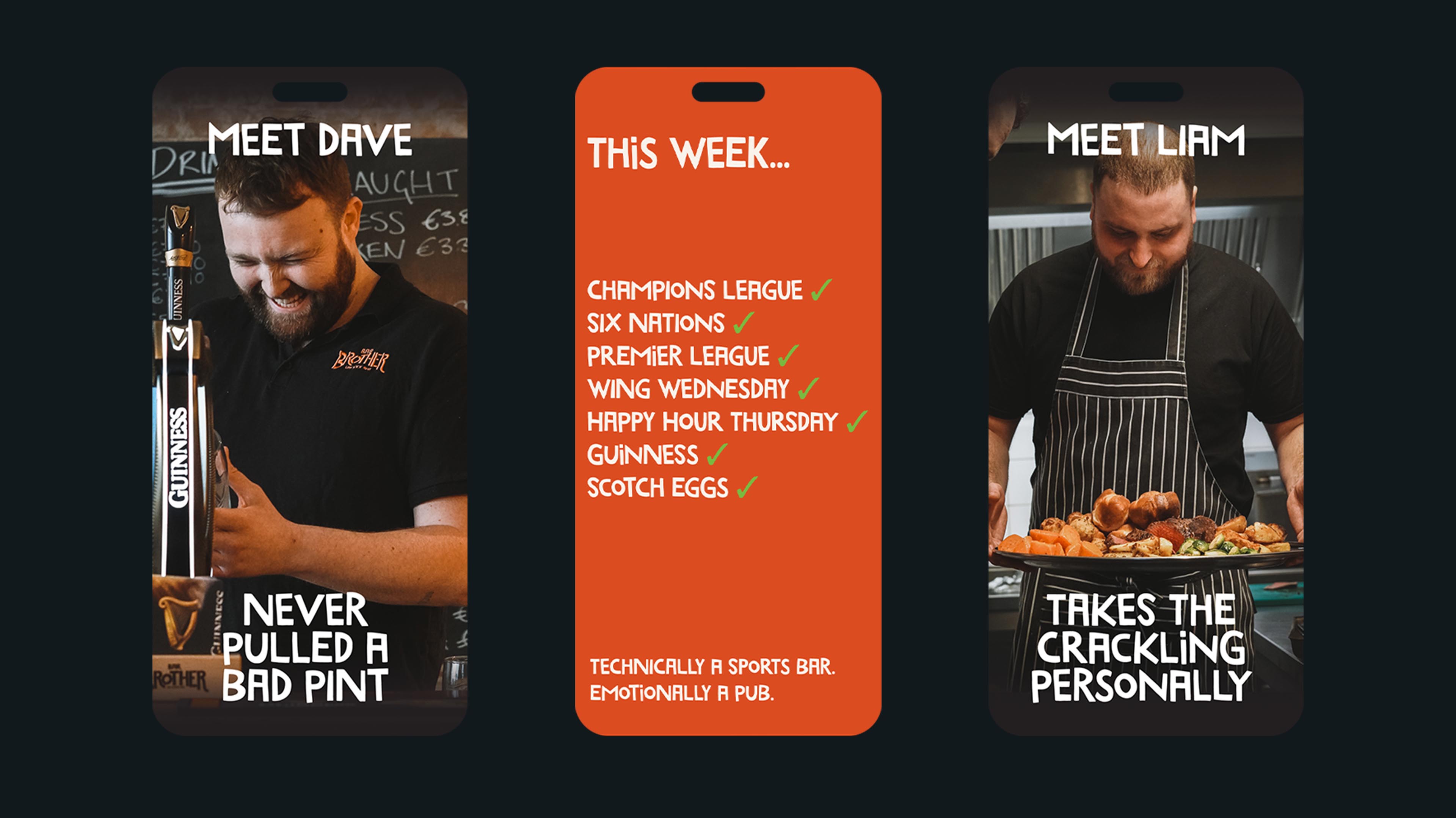 I worked with the pair to refresh the identity, and the result was a big, bold brand that carried the heart of the original into the new space. Technically a sports bar, emotionally a pub—Bar Brother became a go-to spot for homesick Brits and a distinctive experience for locals.